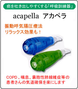 ※アカペラには緑色と青色の2つのタイプがあり、青色は「低肺機能用」として設計されているためほとんどの患者さんにおいて使用可能です。 |